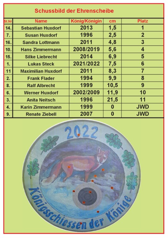 Seit 1991 wurden insgesamt 30 Könige und Königinnen ausgeschossen. Es hatten 12 Majestäten an diesem Treffen teilgenommen. Auch in diesem Jahr fertigte Hans Zimmermann, zu diesem Anlass, eine königliche Scheibe an. Geschossen wurde auf 50m mit dem Kleinkalibergewehr. König der Könige wurde Sebastian Huxdorf.